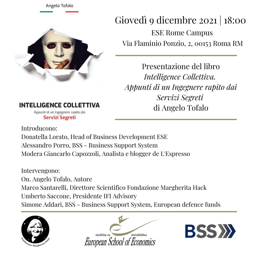 Giovedì 9 dicembre alle 18:00 parteciperò, in qualità di direttore scientifico della Fondazione Margherita Hack, alla presentazione del libro, "Intelligence Collettiva. Appunti di un Ingegnere rapito dai Servizi Segreti", scritto da Angelo Tofalo ed edito dalla Fondazione, nella sede di Roma dell'European School of Economics (ESE).